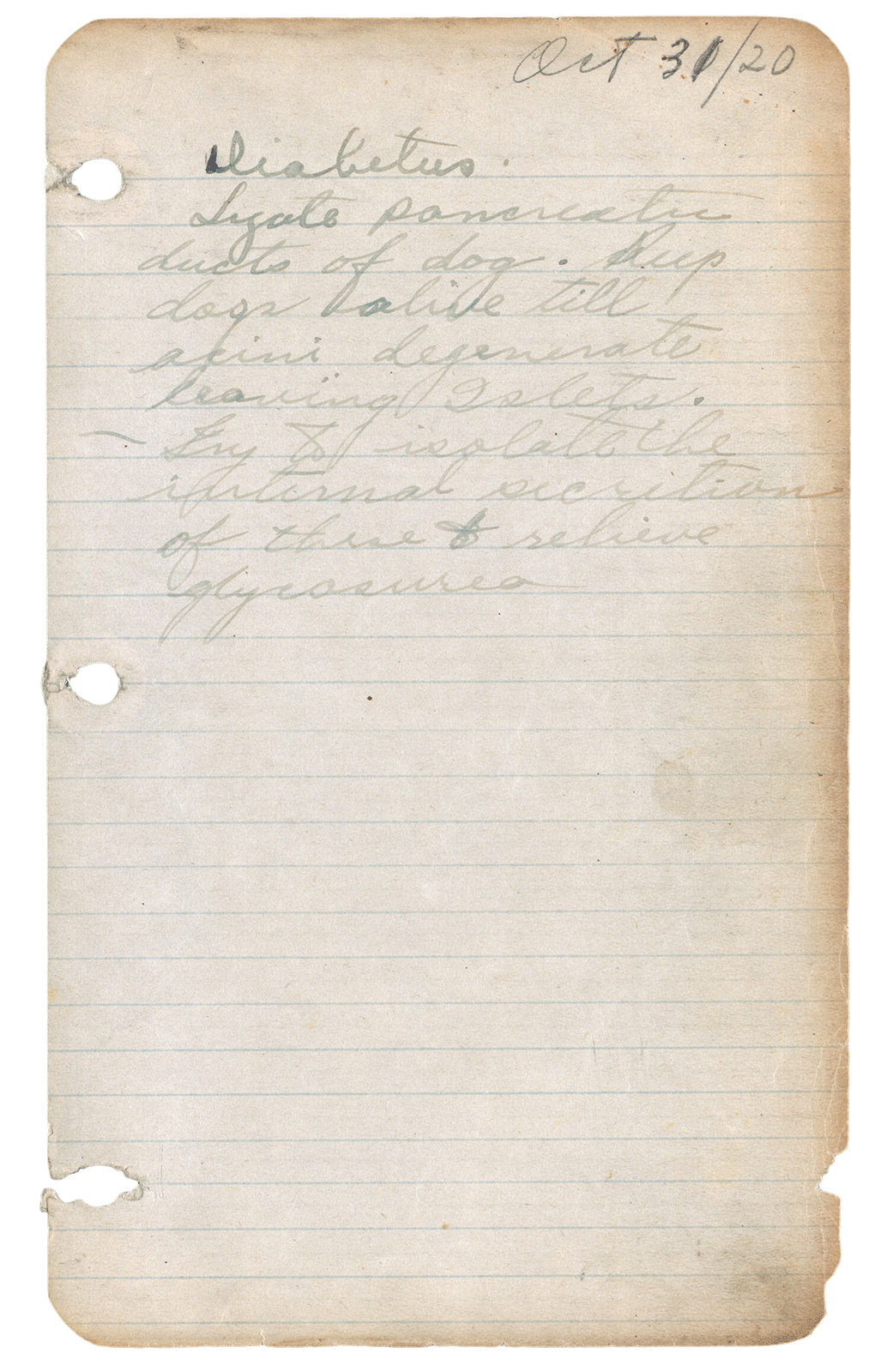 Ideja o inzulinu se je pri Bantingu porodila v jutranjih urah 31. oktobra 1920. Ko se je zbudil, je na list papirja v le 25-ih besedah zapisal hipotezo, ki je v enem letu privedla do ene od najpomembnejših medicinskih odkritij 20. stoletja.